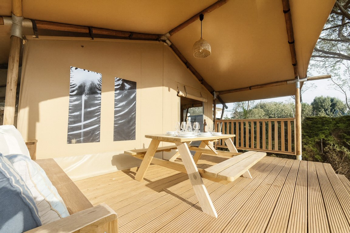 Yes, the tent is especially suitable for families thanks to its two sleeping areas, private bathroom, equipped kitchen, patio, barbecue and private hot tub.