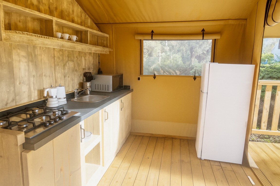 Yes, the tent includes an equipped kitchen, perfect for preparing meals independently during your stay.