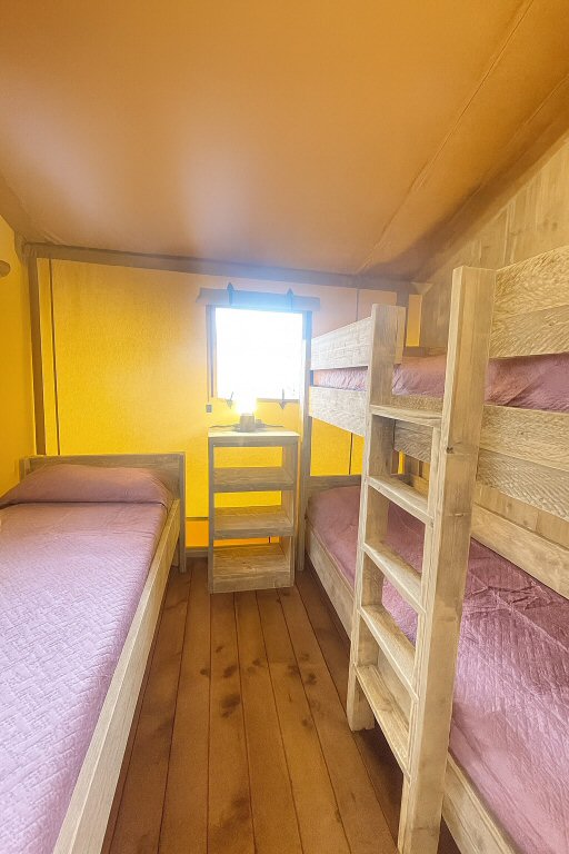 The tent has two sleeping areas: one double bedroom and a second bedroom with one single bed and one bunk bed.