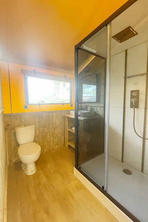Yes, the 5-person glamping tent includes a private bathroom with shower.
